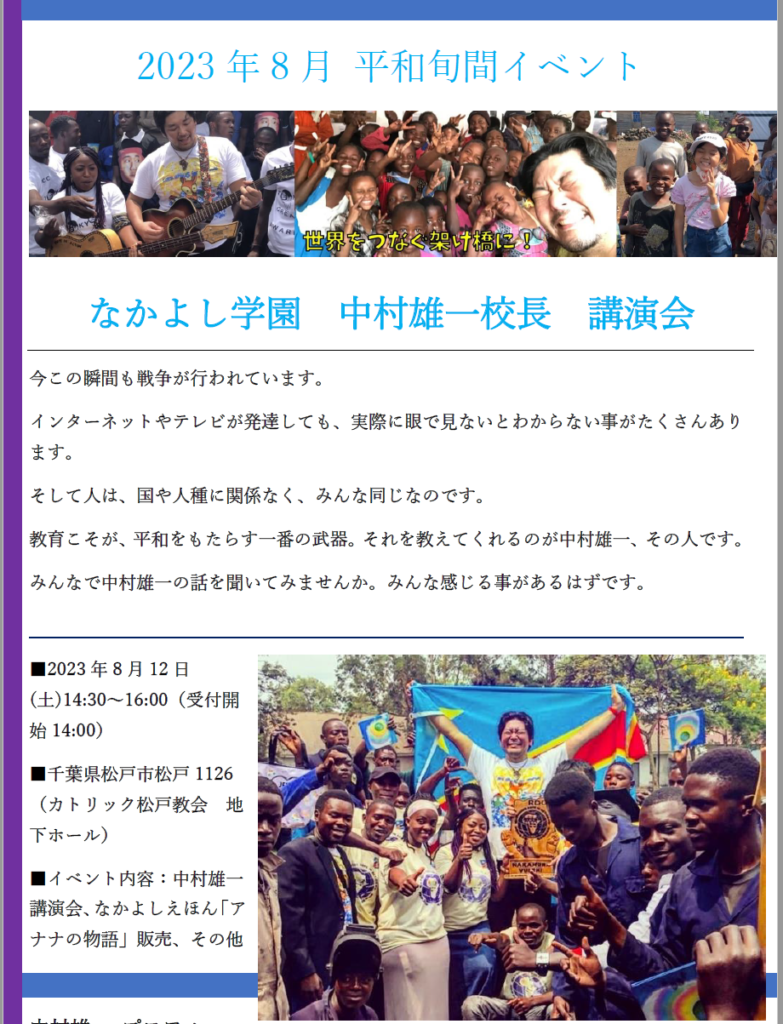 August 12 (SAT), at 14:30, “Lecture Meeting of Nakayoshi School President NAKAMURA Yuichi” will be held in the Parish Hall downstairs. See broucher below for detail.